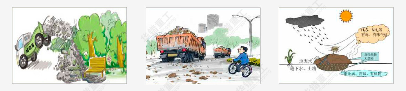 大多數(shù)城市建筑垃圾堆放地的選址在很大程度上具有隨意性,留下不少安全隱患。在外界因素的影響下,堆出現(xiàn)崩塌,阻礙道路甚至沖向其他建筑物的現(xiàn)象時有發(fā)生。 | 建筑垃圾在堆放和填埋過程中,由于發(fā)酵和雨水的淋溶、沖刷,以及地表水和地下水的浸泡而滲濾出的污水——滲濾液或淋濾液,造成周圍地表水和地下水的嚴(yán)重污染。 |